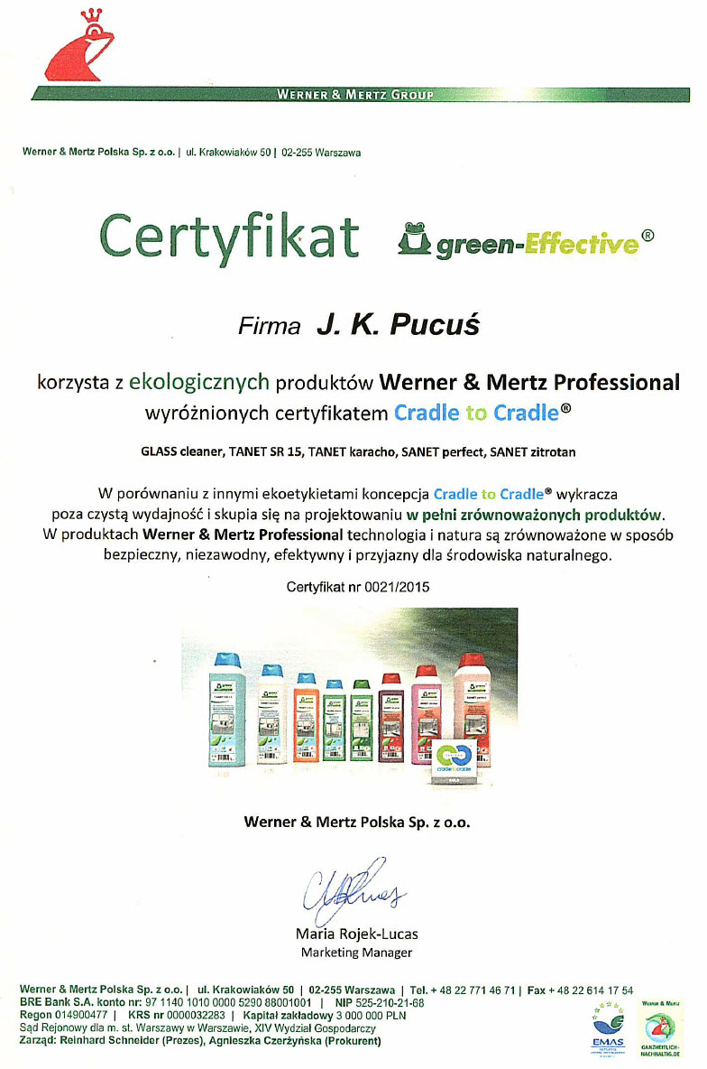 Nasze sukcesy - za naszą pracę „aktywne uczestnictwo i osiągnięte wyniki” zostaliśmy wyróżnieni Certyfikatem „Super Gwarant Czystości i Higieny”, a za podejście do wyboru środków czyszczących Certyfikatem Green-Effective. Przyznane nam wyróżnienia pokazują, że jest to słuszna droga i właściwy sposób świadczenia usług.