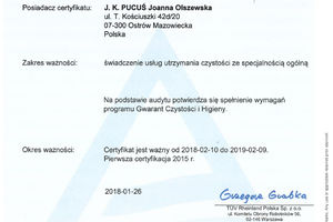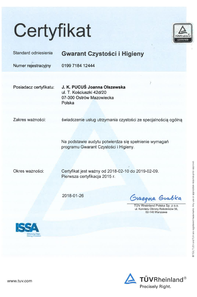 Wysoką jakość naszych usług potwierdza certyfikat prestiżowego programu GWARANT CZYSTOŚCI I HIGIENY przyznawany przez TÜV Rheinland Polska Sp. z o.o., ISSA The Worldwide Cleaning Industry Association oraz Polską Izbę Gospodarczą Czystości.